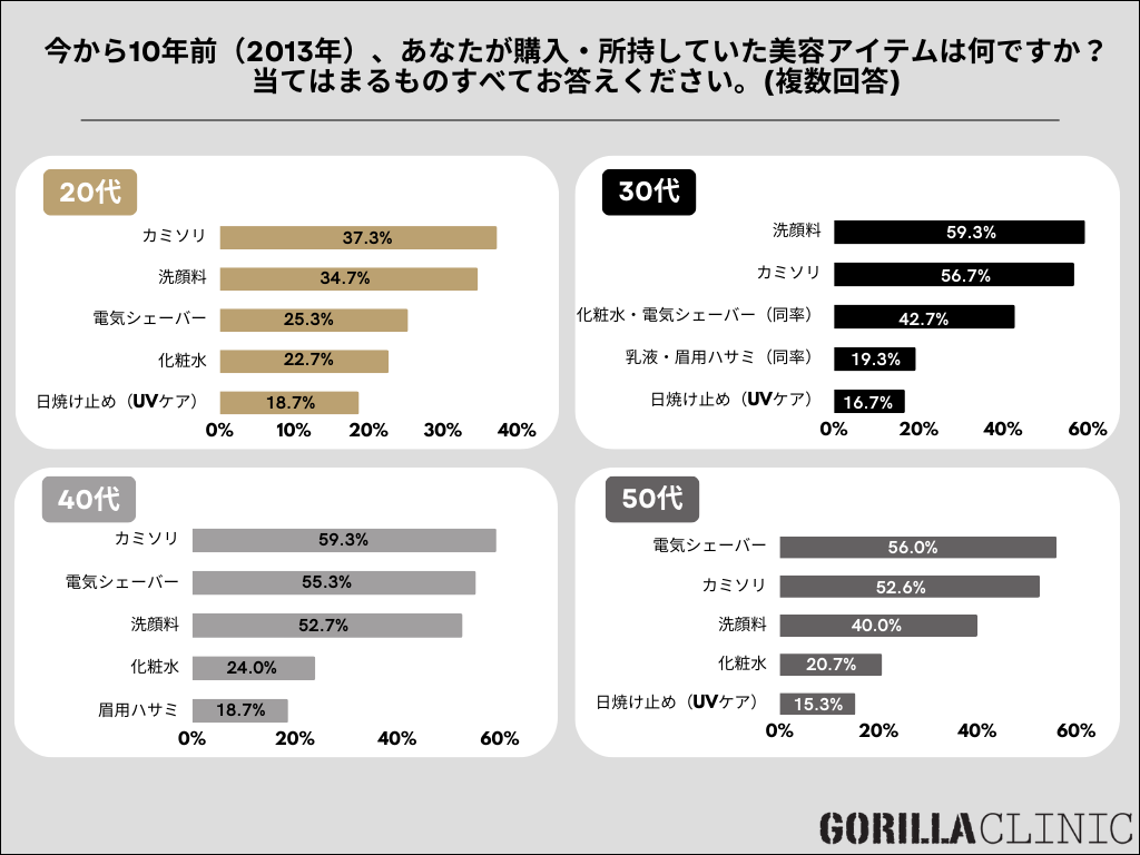 また、【あなたが10年前(2013年)に所持していた美容アイテムは?】の問いに、男性全体の2人に1人が「カミソリ(51.5%)」と回答するも、【あなたが直近1年間で所持している美容アイテムは?】の質問では、10年前に1位だったカミソリを抜き、各世代ともに「洗顔料」がトップに。