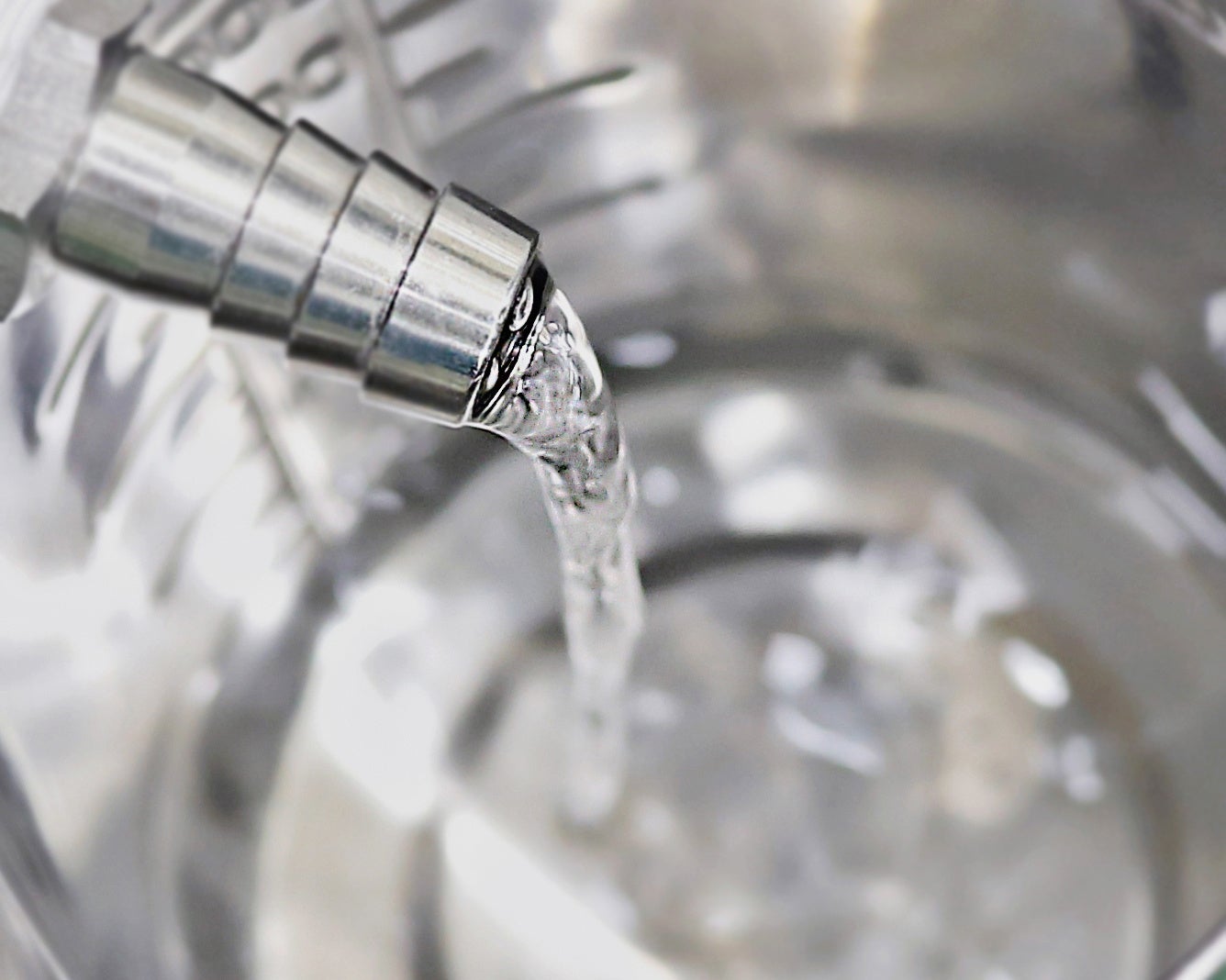収穫された花は、茎や葉、蕾とともにやさしくほぐされ、さらに細かく撹拌されます。その後真空低温蒸留器に投入すると、水を使うことなく液体と固体に分離。非常に高度な技術で花の水分がそのまま集められた液体は、純度の高いエキスとなります。