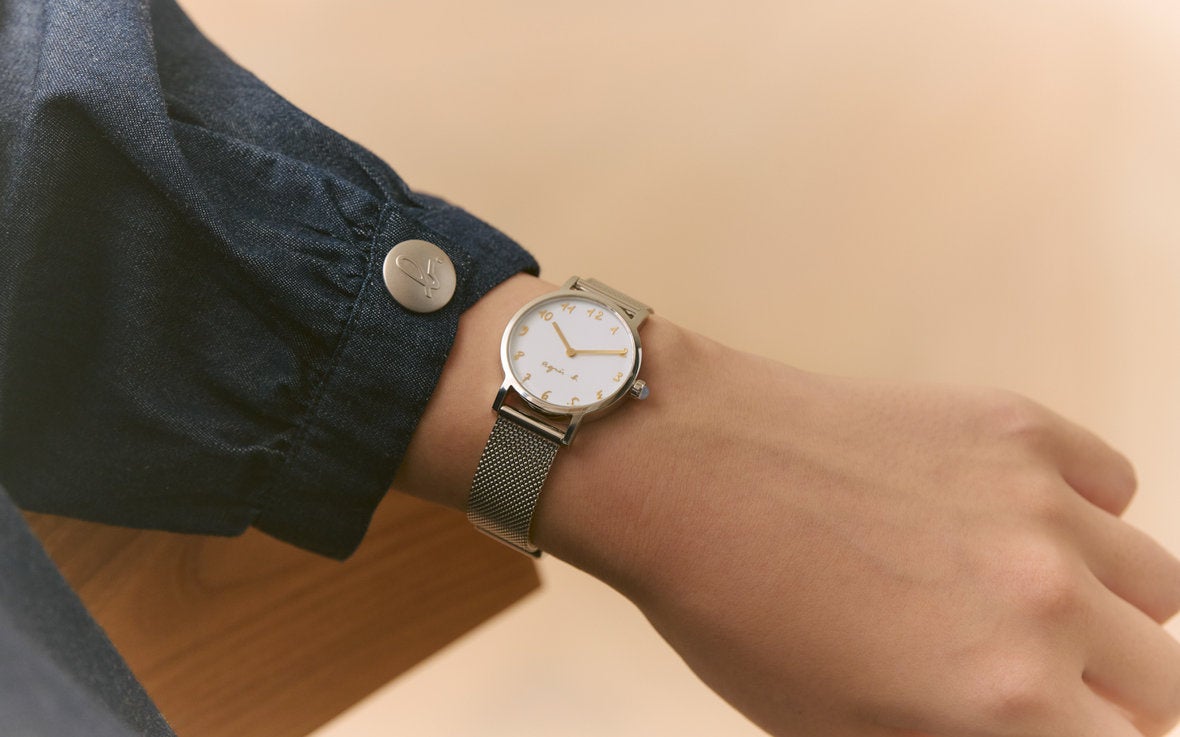 文字盤にはデザイナー、アニエス・トゥルブレ自身の手描きのアラビア数字を配し、リューズにはブランドのアイコンである”カーディガンプレッション”のパールボタンをイメージしたストーンを装飾。バックルは、レザーベルトは尾錠式、メッシュブレスはスライド式を採用。