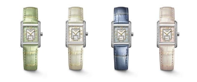 スタイリッシュなカラーのモデルは、煌めくダイアモンドをケースにあしらい、ミント・グリーン、アイボリー・ホワイト、セレーネ・ブルー、ブロッサム・ピンクの4色で展開。ゴールドカラーのローマ数字と針が立体的な印象のレクタンギュラーダイアルは、ダイアル内の外側のスクエアの色をレザーストラップと調和させ、内側のスクエアに優美なギョーシェ装飾を施して効果的なコントラストを生み出しました。ファッション性に優れ、腕元に美しく映えるタイムピースです。