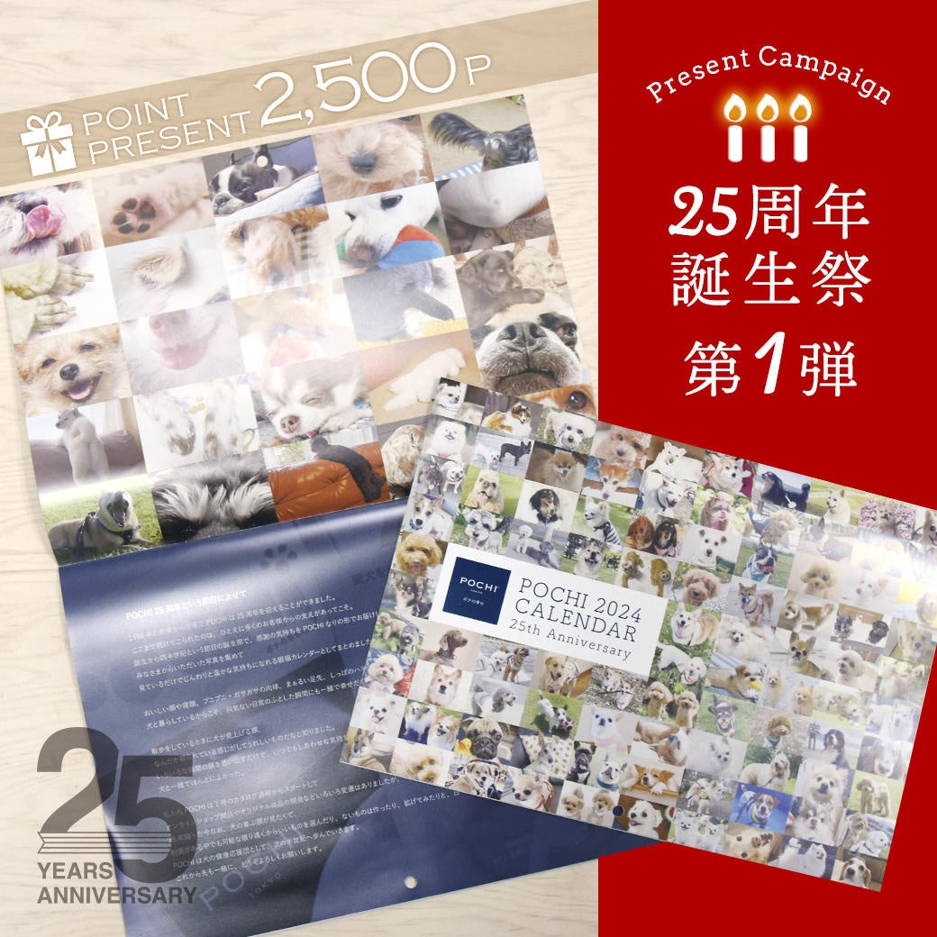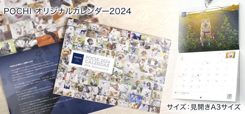 皆様から送っていただいた「うちの子」の幸せを感じる写真を集めた「POCHI オリジナルカレンダー2024」(見開きA3サイズ)を製作しました。おいしい顔や寝顔、プニプニ・ガサガサの肉球、まぁるい足先、しっぽのハネなどなど、犬と暮らしているからこそ、何気ない日常のふとした瞬間にも一緒で幸せだなぁと感じれることが多くあります。見ているだけでじんわりと温かな気持ちになれる眼福カレンダーです。25周年の誕生祭に合わせた先着5000名さま全員にプレゼントします。POCHIのカレンダーと共に、みなさまと犬たちとの生活が笑顔溢れるものになれば幸いです。(数量限定のため、リリース時に終了している場合があります。先着数に達しましたら、予告なく終了いたしますのでご注意ください。)
