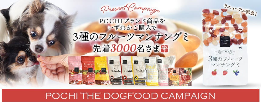 今年、新発売したPOCHI新オヤツをもっとたくさんの犬たちに試してもらいたいと、POCHIの25周年に合わせてどーんとプレゼントします。パッケージが新しくなった「POCHI 3種のフルーツマンナングミ」を、POCHIブランド商品いずれかご購入の方先着3000名さまに、プレゼントします。(詳細は、下記のURLをご参照ください。)