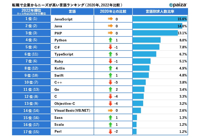「プログラミング言語に関する調査(2022年版)」の結果を発表。平均年収が高い言語、転職で企業ニーズが高い言語など
