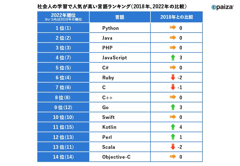 2018年および2022年の「paizaスキルチェック*」のうち、本調査ではランクが測定できるテストのみを抽出。その受験回数を言語別に算出し、ランキングを比較。(社会人2018年:N=396,614、社会人2022年:N=572,008、学生2018年:N=131,066、学生2022年:N=326,107)