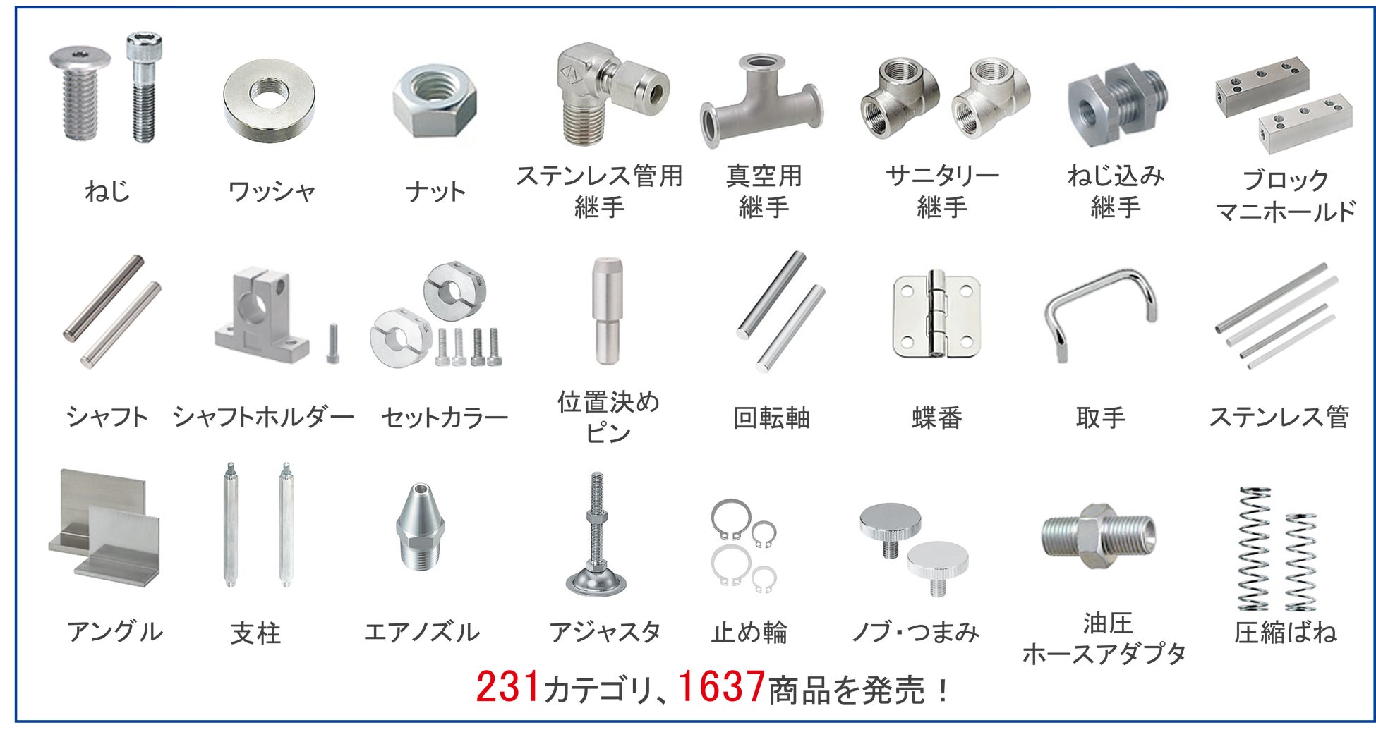 ✓ 豊富なラインアップ : メカニカル部品のステンレス品に大幅対応、231カテゴリ、1,637商品を展開