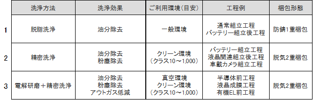 洗浄方法はご利用環境にあわせて「脱脂洗浄」「精密洗浄」「電解研磨+精密洗浄」からお選びいただけます。