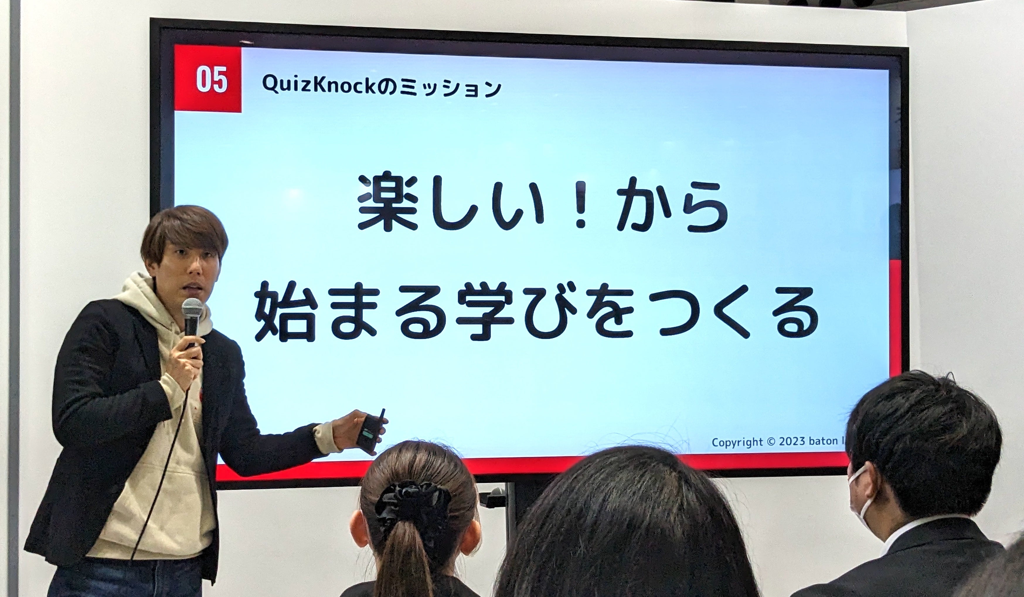 講演の後半部分では、QuizKnockを運営する株式会社batonで開発中のサービスの紹介なども交えつつ、QuizKnockのコンテンツがもっと教育現場で活用される未来の展望を語りました。