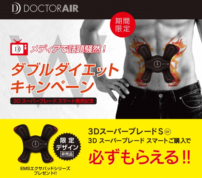 2018年4月23日(月)~2018年7月1日(日)の期間中3Dスーパーブレードシリーズの購入特典として、本キャンペーンでしか手に入らない電極部が4極の限定デザイン「ドクターエア EMSエクサパッドSmart」(非売品)をもれなくプレゼト。