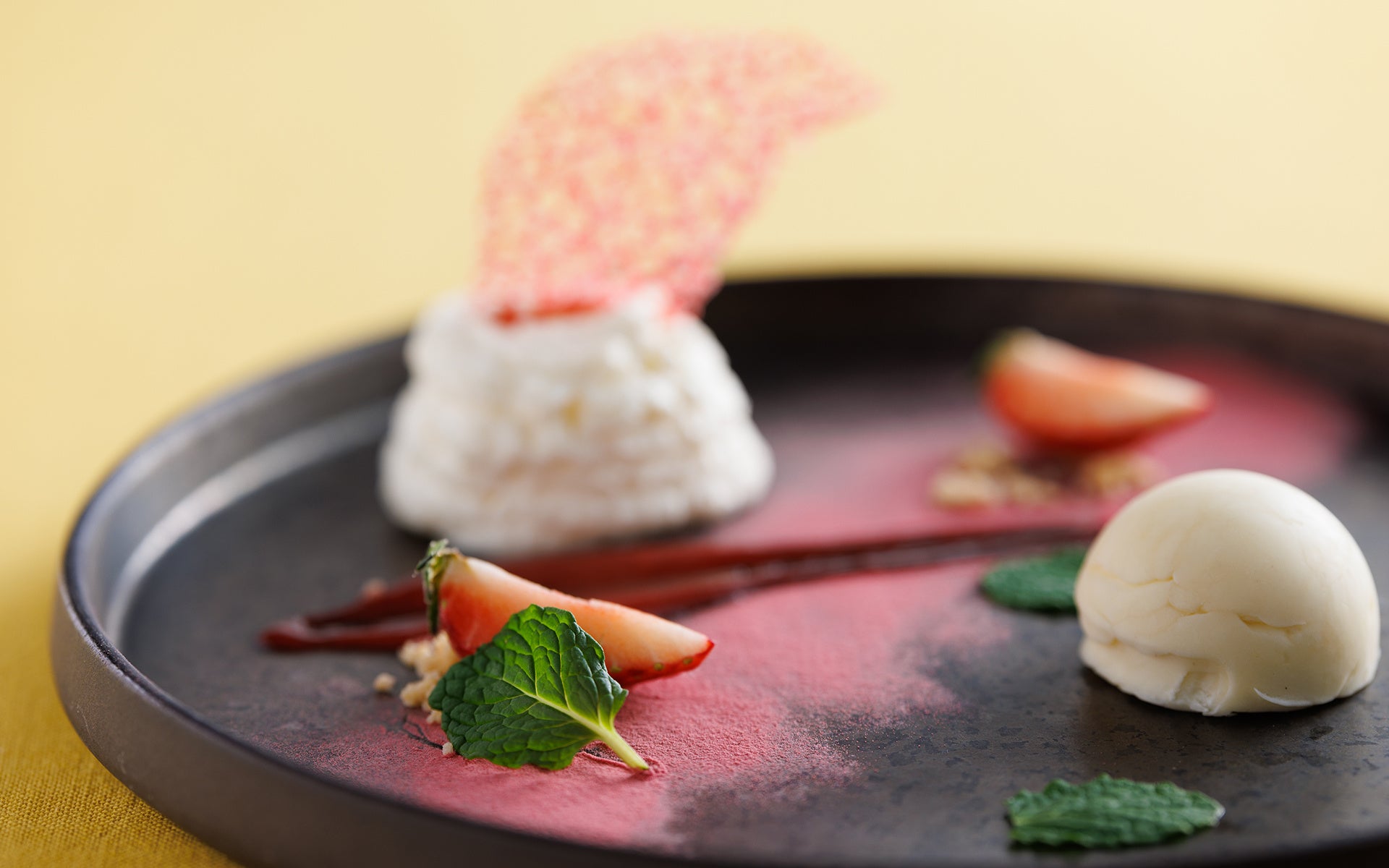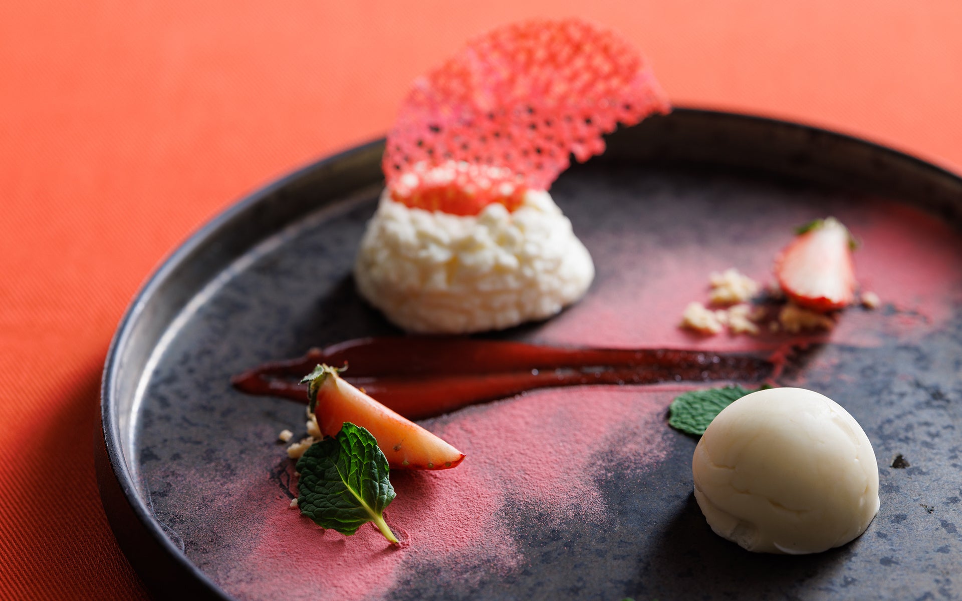 ふわっとしたエスプーマティラミスの中には、甘くマリネした苺が入っています。バニラアイスとともに、イチゴのピューレ・パウダーで召し上がってください。