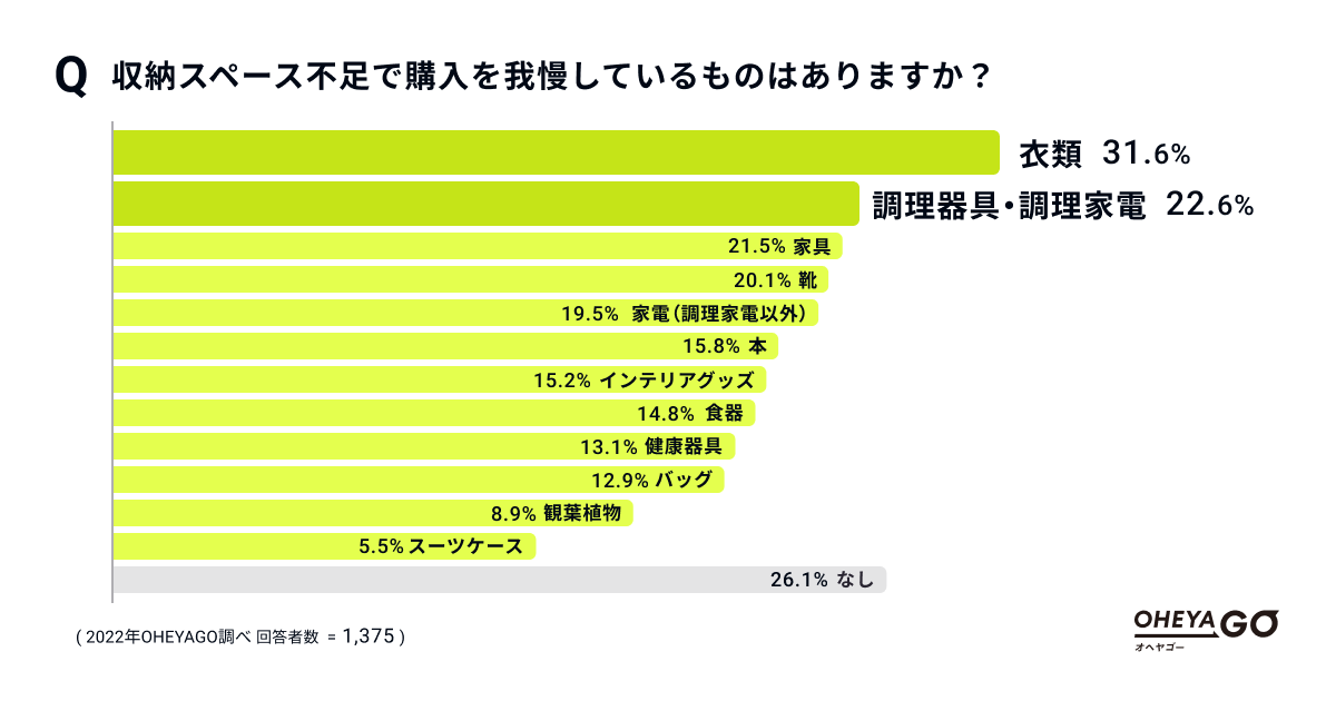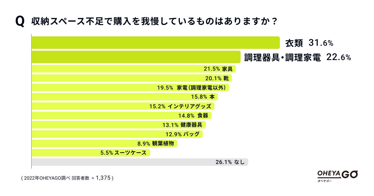 - 収納不足で購入を我慢しているものランキング1位は「衣類」、次点が「調理器具・調理家電」