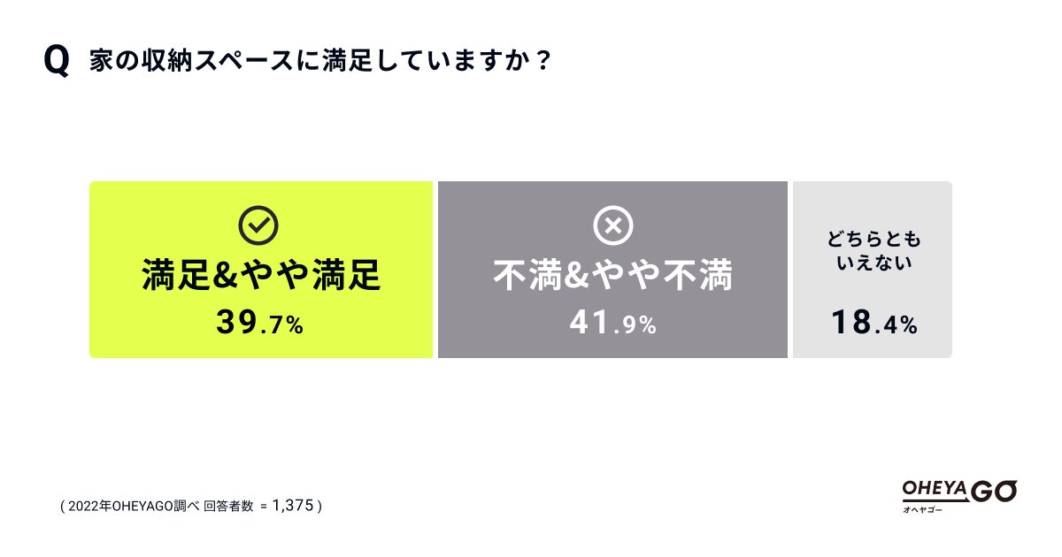 - 現在の家の収納スペースに満足している人と不満がある人の割合はほぼ同数