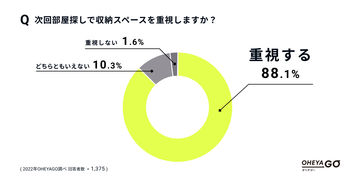 回答者のうち88.1%の人が、次に部屋を選ぶ際に収納スペースを重視するという結果となりました。