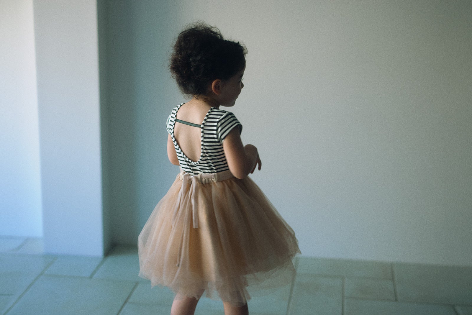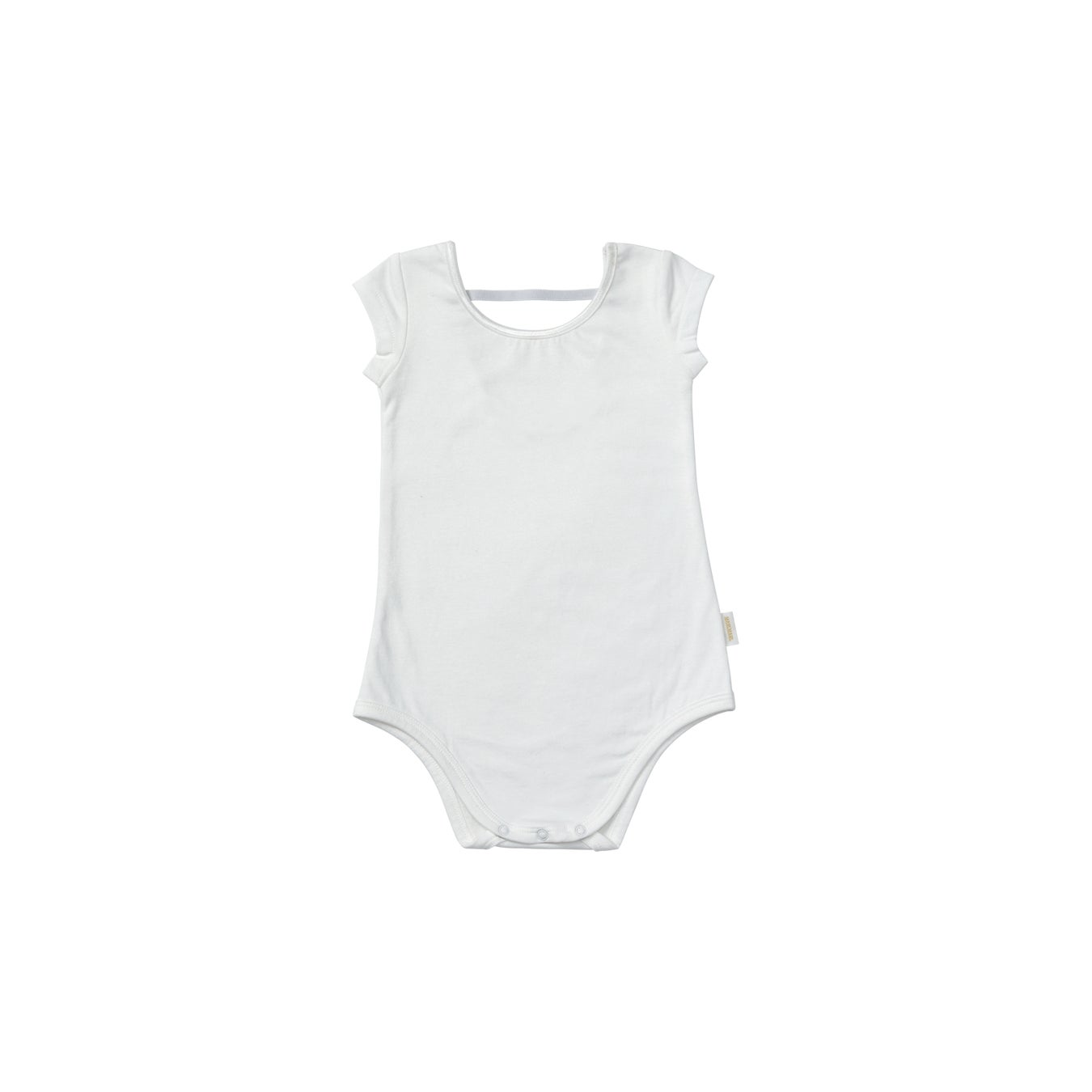 バレリーナのような後ろ姿が映えるカットソー。ボディスーツ型で肌着なしで着られるよう、 前見頃は2重に仕立てています。
