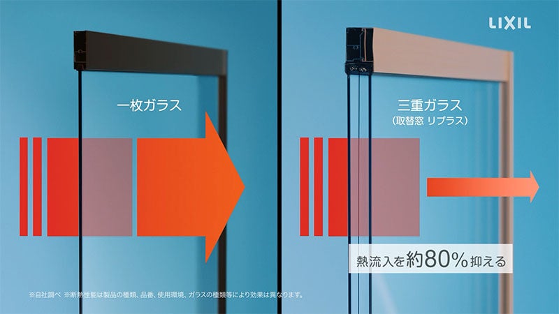 取替窓「リプラス 高断熱汎用枠」は、今ある窓をたった1日(※4)で、新築レベルの高性能なトリプルガラスのハイブリッド窓(熱貫流率1.23W/㎡・K)に交換することができる製品です。1枚ガラスの窓に比べて、トリプルガラスの窓は熱流出をおよそ80%(※3)も抑えることができるので、省エネで快適な暮らしを実現します。
