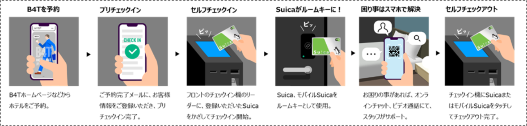JR東日本スタートアップ株式会社(代表取締役社長:柴田裕、以下「JR東日本スタートアップ」)と株式会社SQUEEZE(代表取締役社長CEO:舘林真一、以下「SQUEEZE」)は、2021年5月より資本業務提携を行い、JR東日本グループとの連携を進めてきました。この度、JR東日本グループが新たに発表したSuicaを活用したスマートホテルブランド「B4T(BED FOR TRAVEL)」において、「Suicaスマートロック」と連携した初のホテル管理システムとしてSQUEEZEの展開しているクラウド型ホテル管理システム「suitebook」が採用されました。これを機にさらにJR東日本グループとの連携を強化し、新たな顧客体験の創造に寄与していきます。