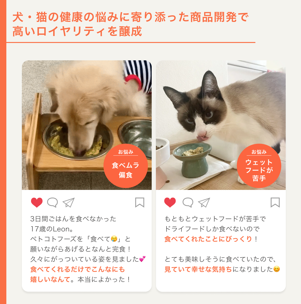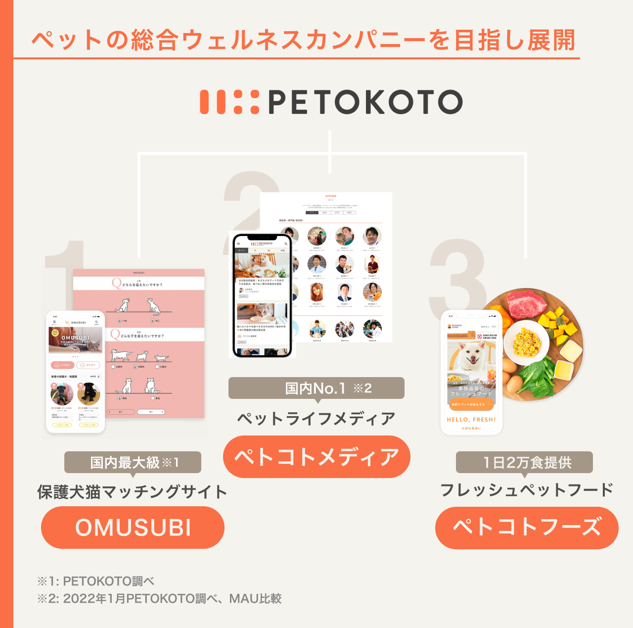 現在は、出逢いの家族化として審査制の保護犬猫マッチングサイト「OMUSUBI」(お結び)、情報の家族化としてペットライフメディア「ペトコト メディア」、食事の家族化として「ペトコトフーズ」を展開し、ペットライフの一生に寄り添うペットウェルネスブランドの確立を目指しています。