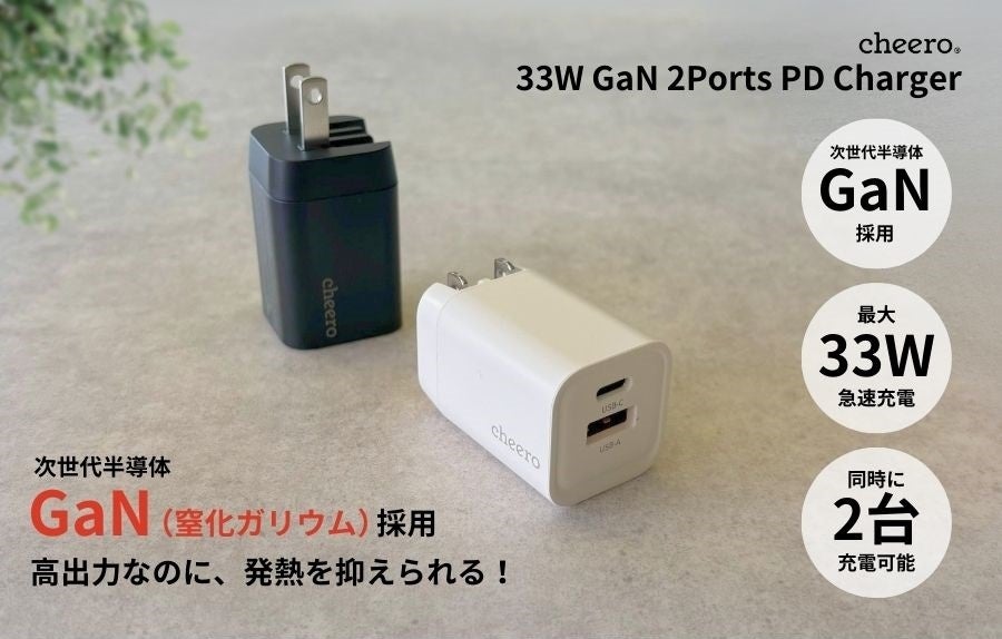 cheero(会社名:ティ・アール・エイ株式会社)は2月15日(木)正午より、「cheero 33W GaN 2 ports USB PD Charger」を発売開始します。