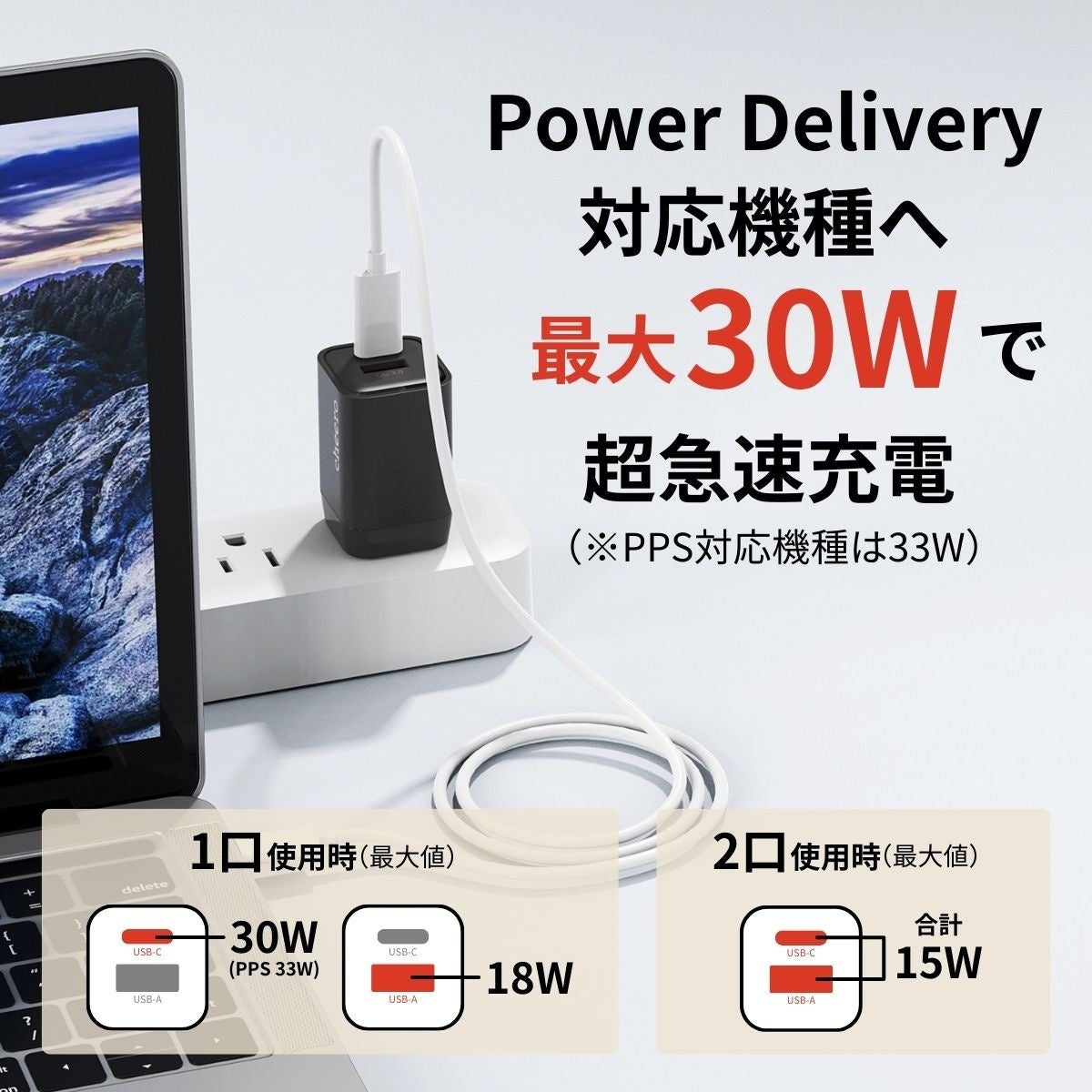 最大33Wの高出力・・・USB-C1ポート単体利用時は最大33Wの急速充電。(※Power Delivery対応機種に充電する場合)