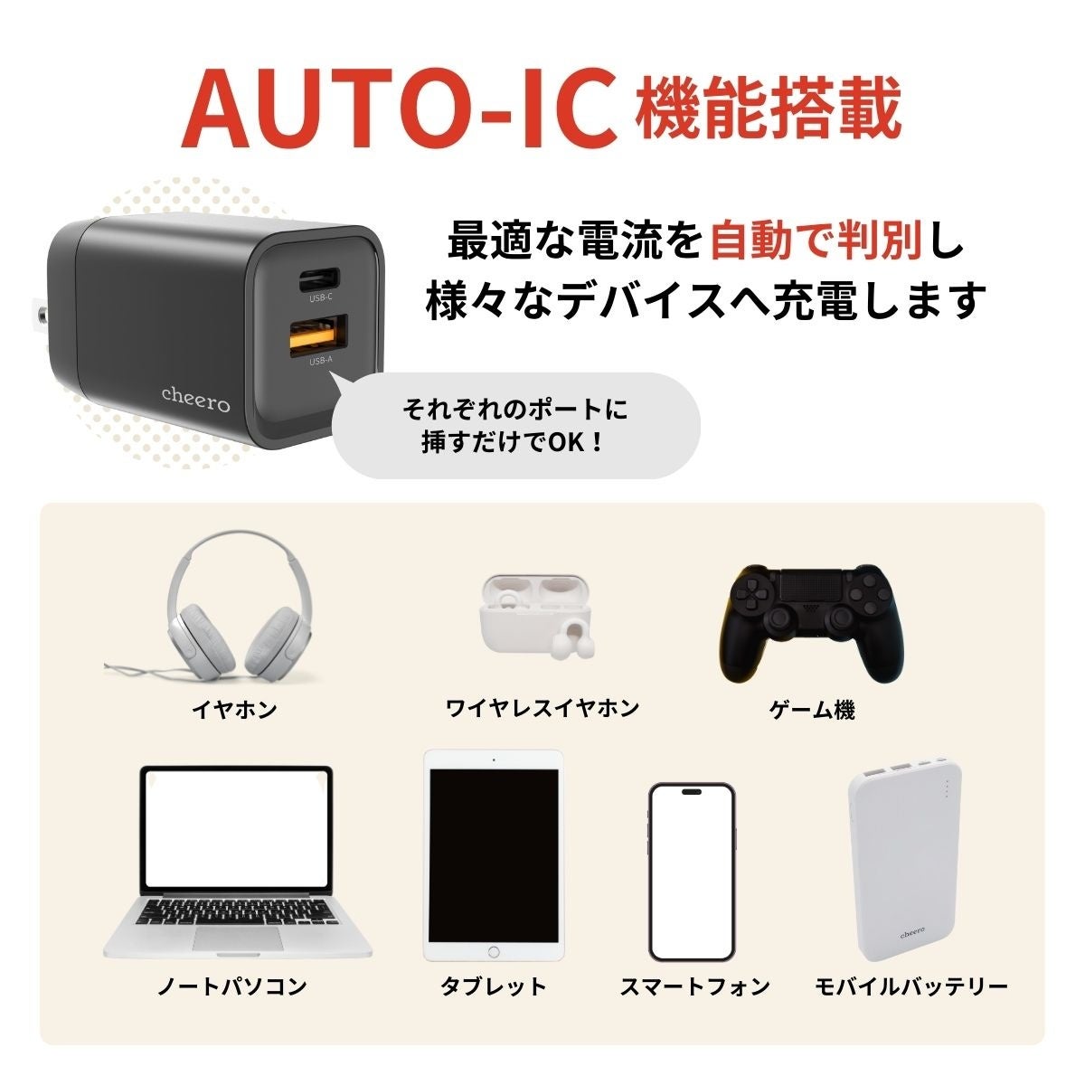 AUTO-IC機能搭載・・・USBポートに挿すだけ!様々なデバイスに最適な電流を自動判別し流します。