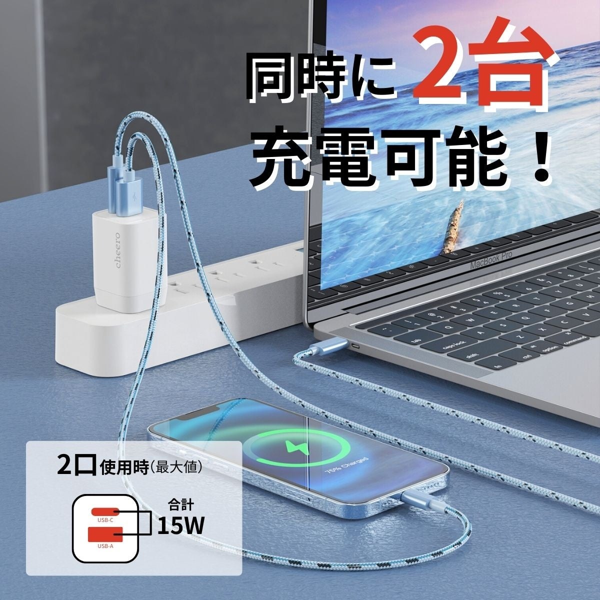 同時に2台充電可能・・・USB-C・USB-A(合計)で最大15Wでの出力が可能!