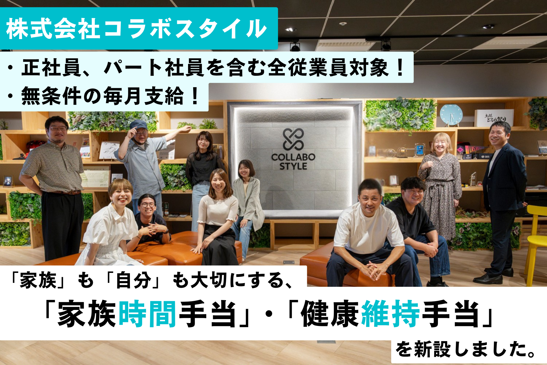 株式会社コラボスタイル(所在地:愛知県名古屋市、代表取締役社長 兼 CEO:松本洋介、以下 コラボスタイル)は、従業員一人ひとりが“いきいきと働く“ことを支援するため、全従業員を対象とした新制度「家族時間手当」と「健康維持手当」を導入しました。