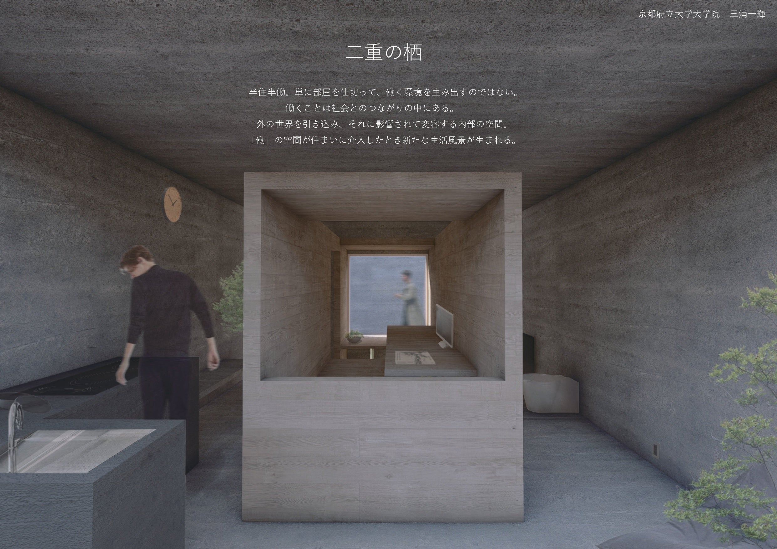 「二重の栖」これは住処の中にできた住処、あるいは住処を纏う住処のようなものです。半住半働というテーマに対し、働くことについて考えました。そこで、他者や外の世界が意識されることが重要であると考え、「仕事は社会とつながる窓」という言葉のように木の構築物を介入させました。それは既存の「住」空間をシームレスなU字型空間に変容させ、新たな暮らしと生活風景を作り出します。緊張感とは断絶された暮らしが周囲にありながら、働く住人の振る舞いは外にあらわれ、外を行き交う人々の存在をおおらかに受け止める寛容さが社会に醸し出されます。