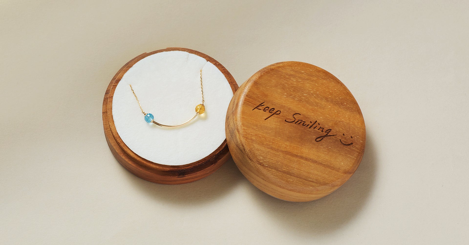 - “Keep Smiling” のメッセージ入り木箱にジュエリーを入れてお届けします