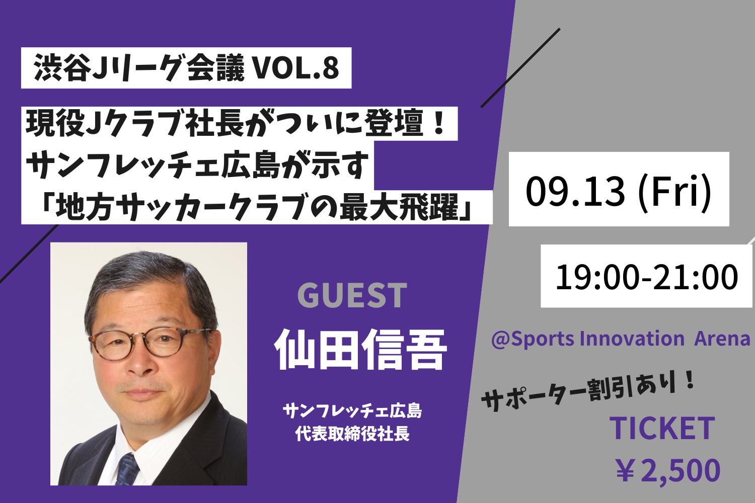 今回のゲストは、明治安田J1リーグに所属するサンフレッチェ広島の仙田信吾社長です。今年の2月に開場したエディオンピースウイング広島は毎試合満席が続き、リーグでも2位に付け優勝争いを繰り広げています。地方都市である広島のクラブが躍進する理由とは。渋谷Jリーグ会議初、現役のクラブ社長の登壇です。