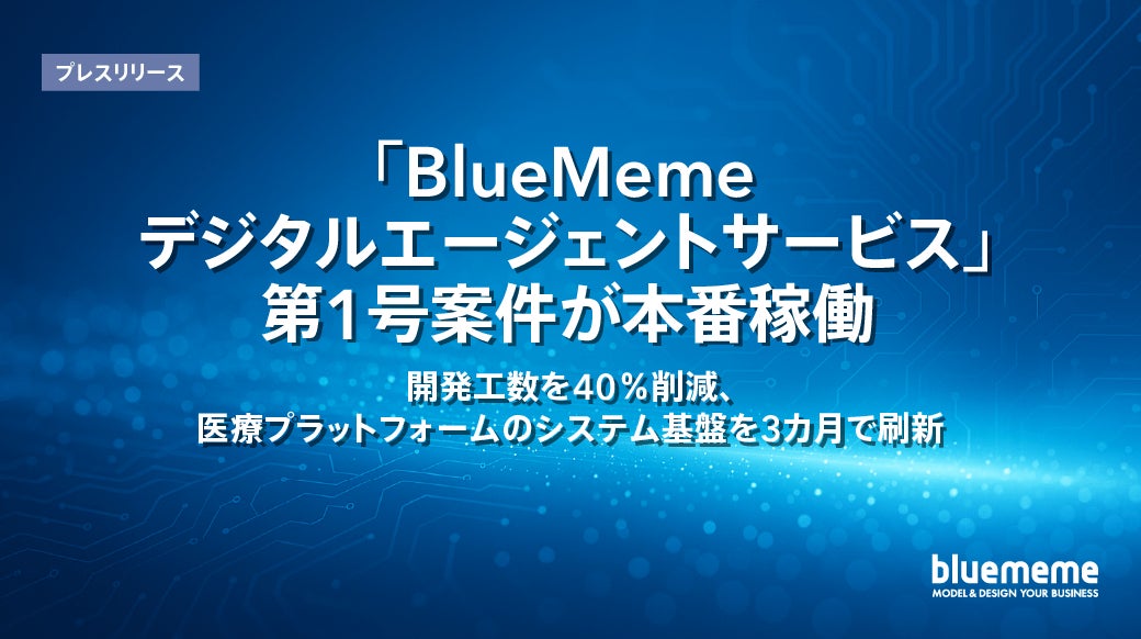 株式会社BlueMeme(本社:東京都千代田区、代表取締役社長:宮脇 訓晴、以下 当社)は、最新の自動化技術とアジャイル手法を統合した「BlueMemeデジタルエージェントサービス」を実案件に適用し、株式会社メディバリー(本社:東京都文京区、代表取締役:平野 弘喜、以下 メディバリー)の医療・ヘルスケアプラットフォーム「Bizcare(ビズケア)」のシステム刷新を完了し、新基盤での本番稼働を開始したことをお知らせします。