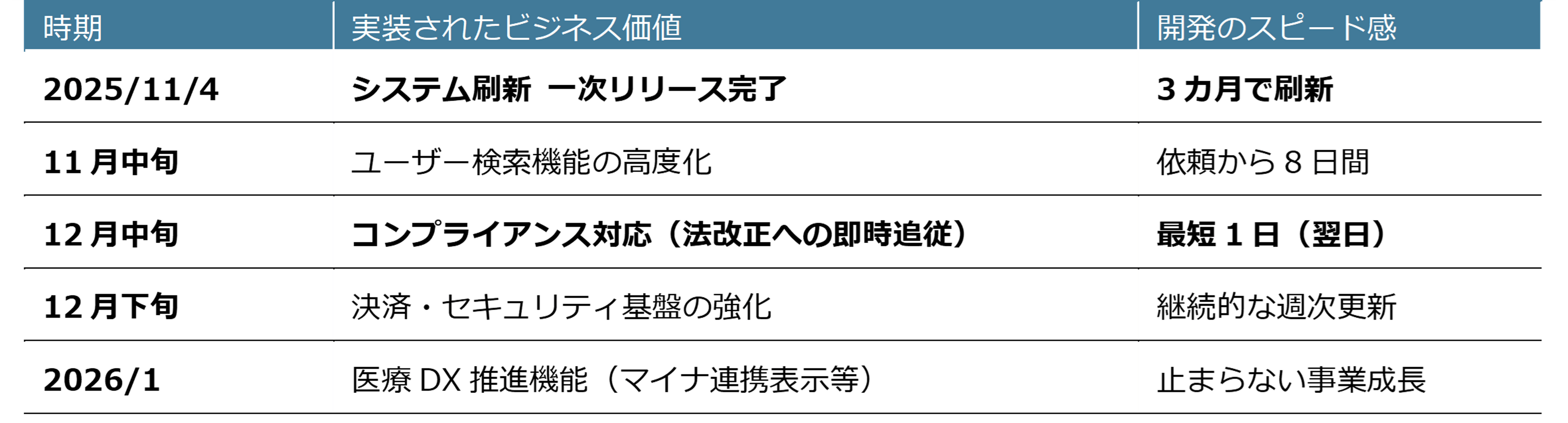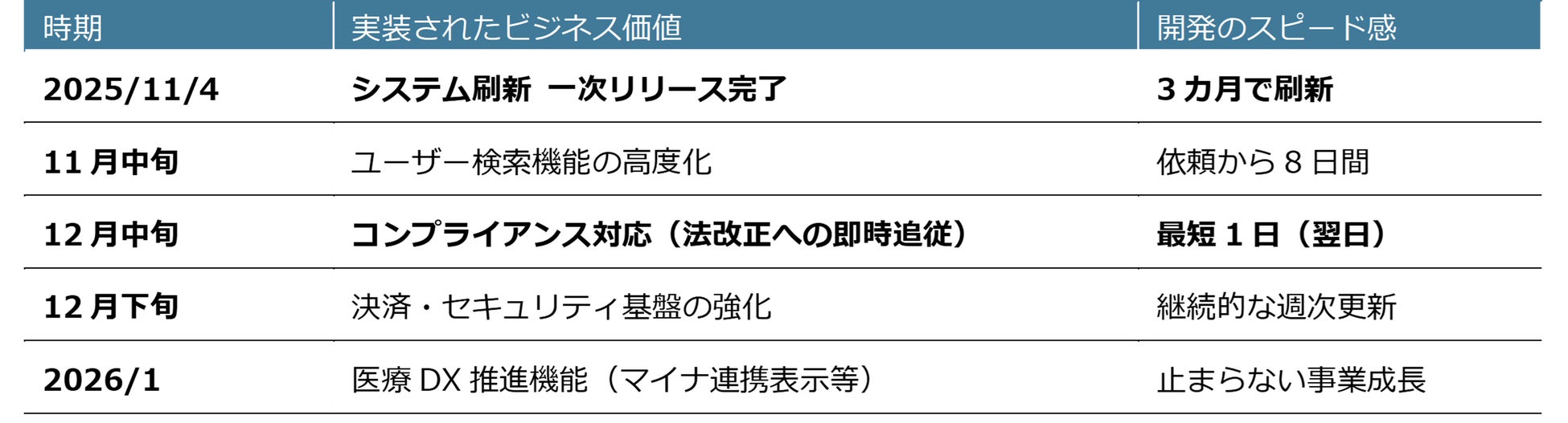 これにより、変化の速い医療DX市場においても、開発の遅れによる事業機会損失のリスクを抑え、経営判断をそのままサービス改善へと反映できる事業運営が可能となりました。