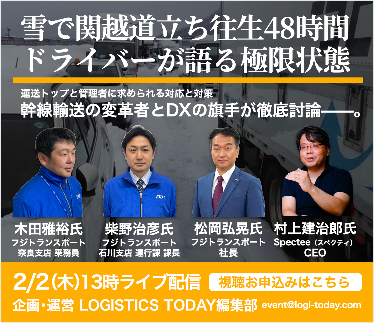 雪・台風・地震・火事・交通事故などの自然災害や事故が発生し、運送トラックの立ち往生や輸送混乱を引き起こす事態が年々増加しています。イベントでは、頻発する災害・事故に対し、物流事業者ができることは何か、被害を経験したドライバーや運行を管理する立場から物流現場のリアルを語り、テクノロジーで危機情報を可視化・被害リスクを予測するスペクティが、運送時における防災テックの可能性を提示します。