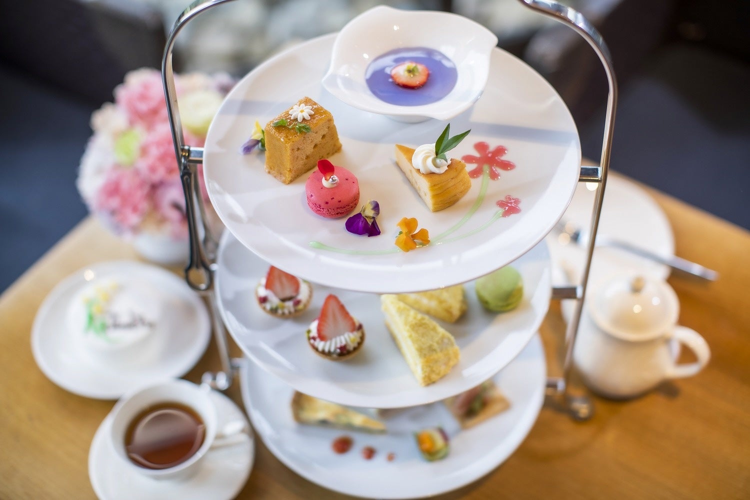 母の日にちなんで、一段目のプレートでは、お花をイメージしたスイーツをご提供いたします。
