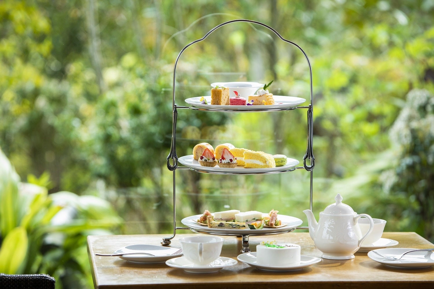 “宮崎テロワール(宮崎の土地が育んだ地元食材の美味しさ)”をテーマに、一段目が宮崎の季節のフルーツや野菜を使ったスイーツ、二段目が生菓子や焼き菓子などの定番スイーツを、三段目では宮崎の食材を使ったプチオードブルをご提供いたします。また、紅茶にもこだわり、スイーツの前に、またはスイーツと供にお召し上がりいただきたい紅茶2種を用意。フルーティーな香りがスイーツ欲をそそる紅茶はお席に着かれてすぐ、定番ながら香り高い紅茶は、スイーツと共にご堪能いただけます。