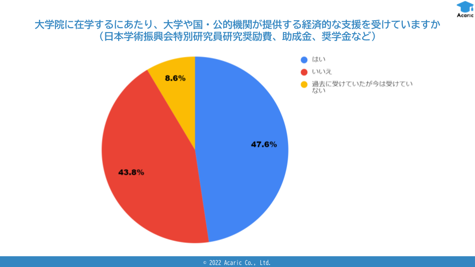 「大学院に在学するにあたり、大学や国・公的機関が提供する経済的な支援を受けていますか。(日本学術振興会特別研究員研究奨励費、助成金、奨学金など)」と質問したところ、「はい」が47.6%、「いいえ」が43.8%となりました。半数近い大学院生が、公的機関から経済的支援を受けています。