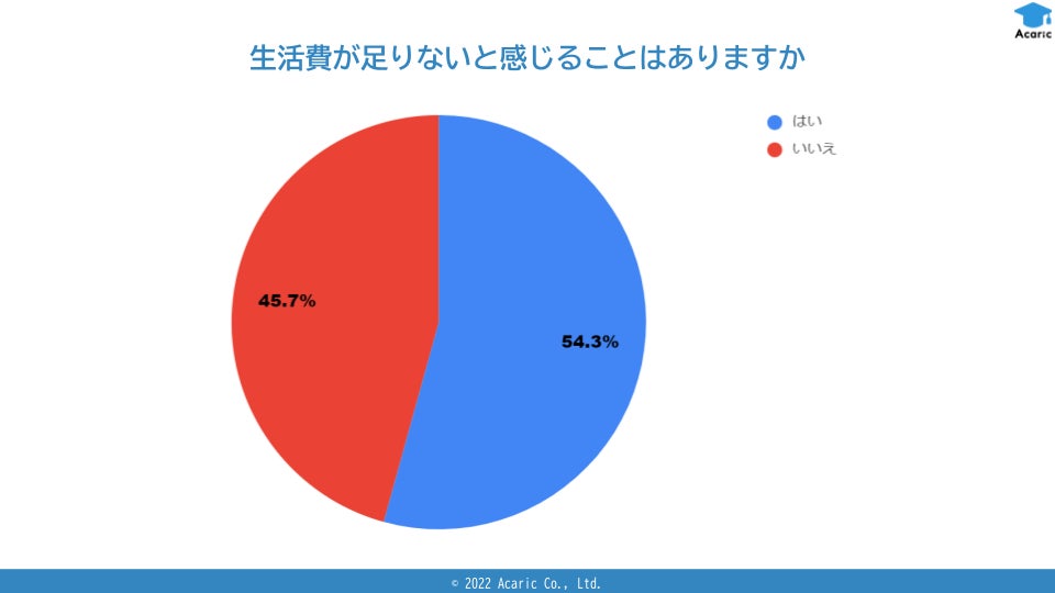 「生活費が足りないと感じることはありますか」と質問したところ、「はい」が54.3%、「いいえ」が45.7%となりました。半数以上の大学院生が、日常的に生活費が足りないと感じているようです。