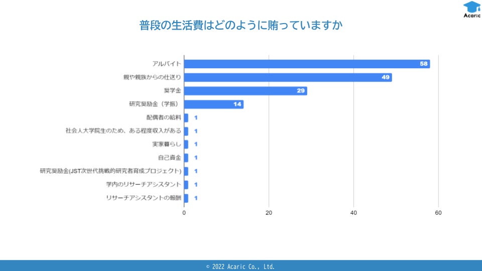 - 生活費は「アルバイト」「仕送り」「奨学金」「研究奨励金」で賄う