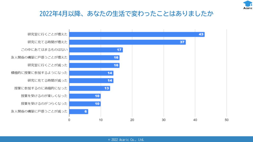 【2022年4月以降の大学院生生活状況調査】対面授業により大学院生の研究は活発化の一方で、友人関係構築に戸惑い。金銭面では、半数の大学院生が公的機関の援助に頼るも、慢性的な生活費不足