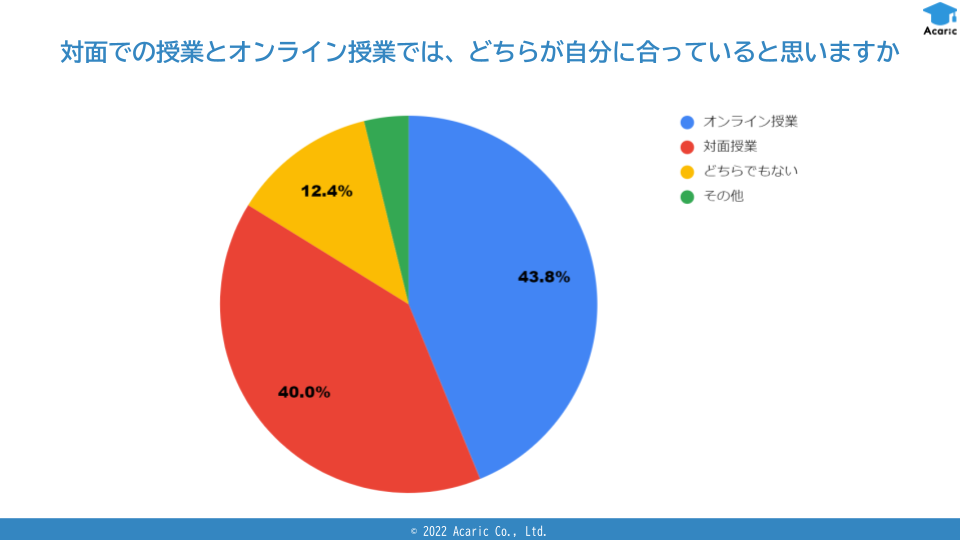 - 自身に合っていると思う授業形式は、「オンライン授業」が43.8%、「対面授業」が40%とどちらとも同程度の割合で需要がある。