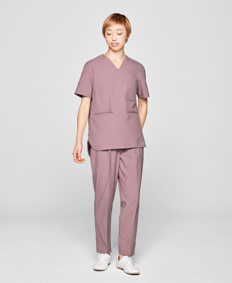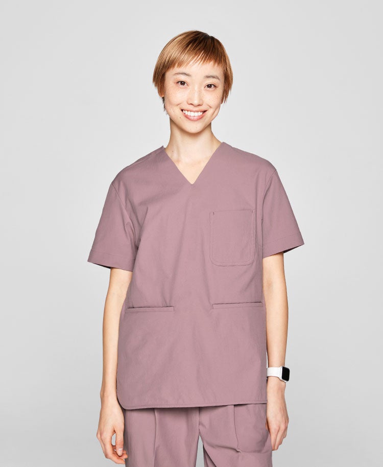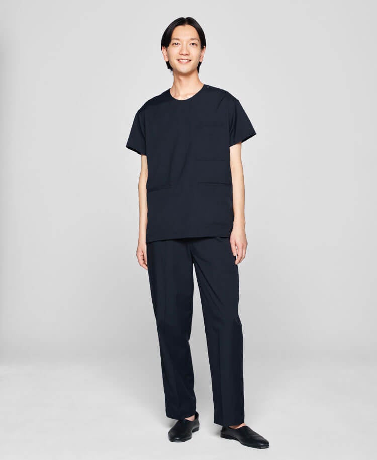 身体のラインを拾わない程よいストレートシルエットで、アクティブながら品格のあるデザインのスクラブ。ヒップにかかるくらいの少し長めの丈感は、しゃがむことが多い現場の業務を考慮しました。裾のカーブラインは柔らかな雰囲気を演出します。
