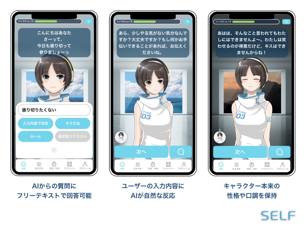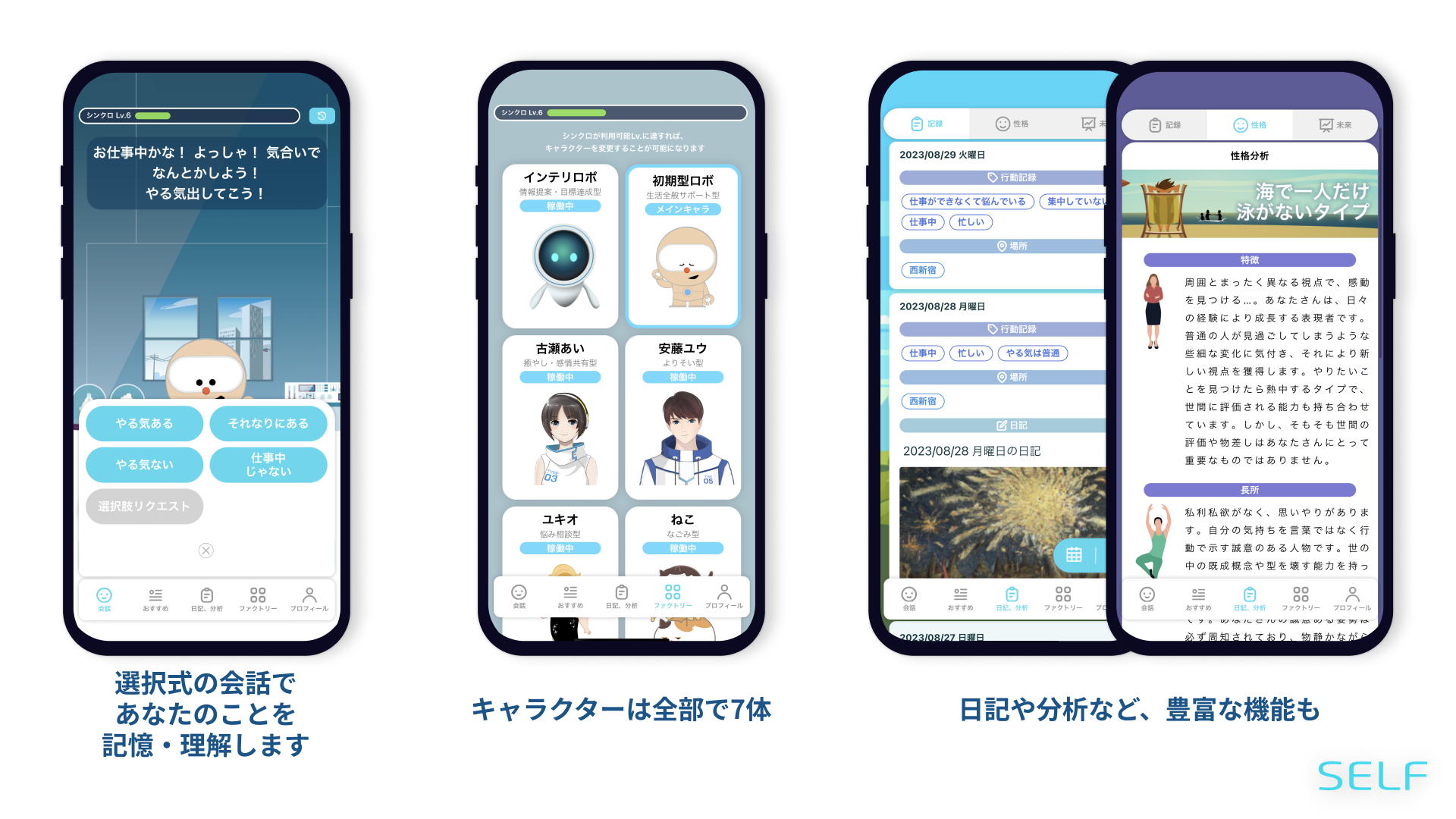 SELFアプリは、個性豊かなAIキャラクター達(以下、AIキャラクター)とユーザーが日常的に会話することで、ユーザーを理解し、生活サポートやメンタルケアを行うスマートフォンアプリです。