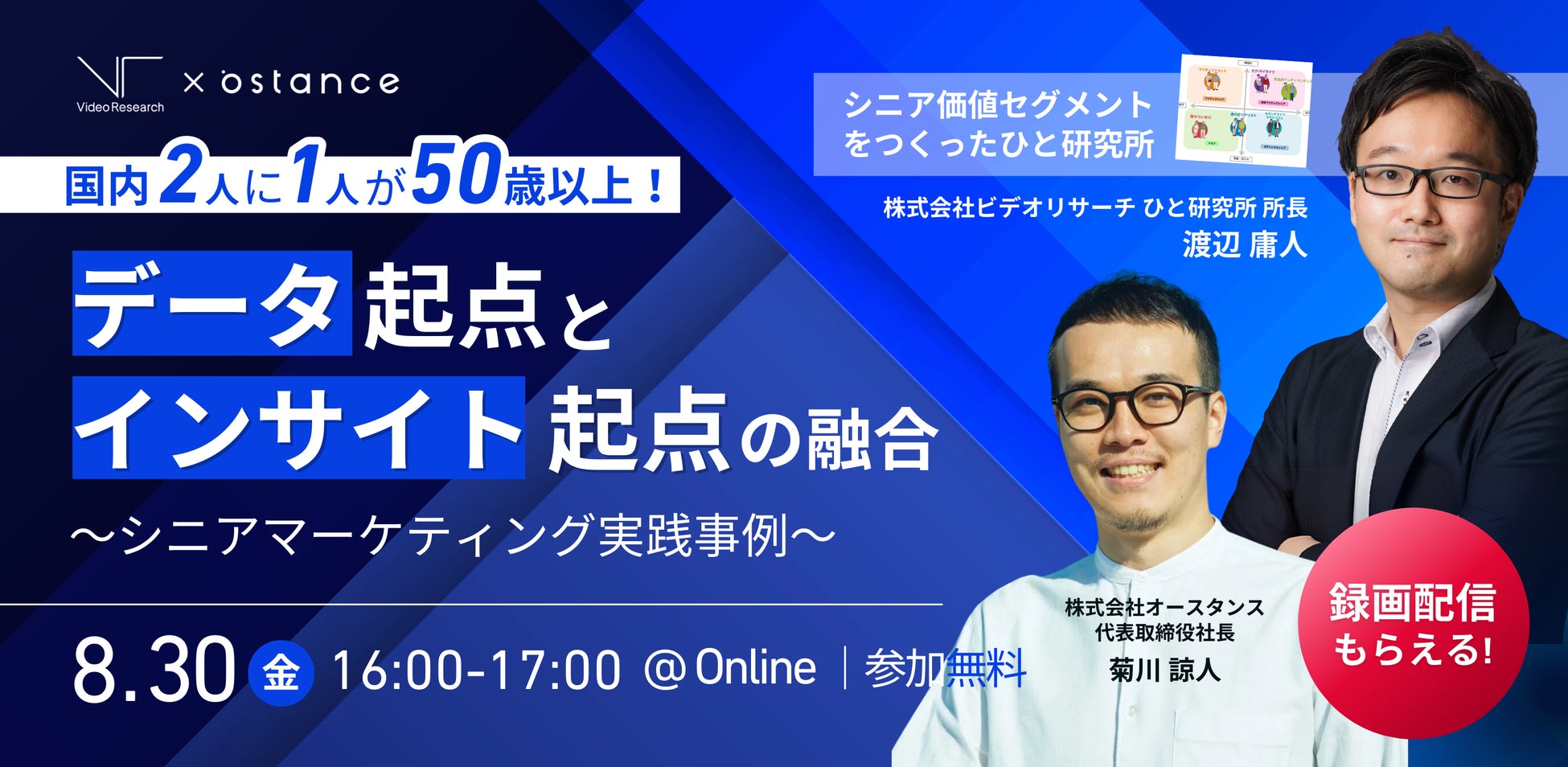 そこで、シニア・中高年領域における事業開発支援を一気通貫している当社のセミナーにシニアの価値観セグメントを構築したビデオリサーチ渡辺様に登壇いただき、データ起点とインサイト起点を融合させた事業・マーケティングの考え方を徹底解説いたします。 事業開発やマーケティングを担当されている方におすすめのセミナーです。是非ご参加お待ちしております。