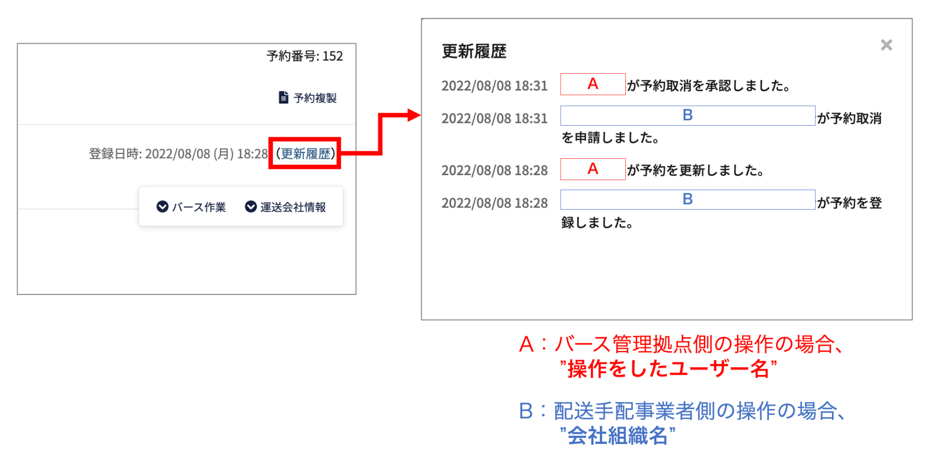 「誰が・いつ・何をしたか」を確認できるため、大規模な物流センターでバース予約を複数人で管理している場合に、意図せぬ変更が入った時や、急な予約の取消等が起こった時も、すぐに把握して対処することができます。