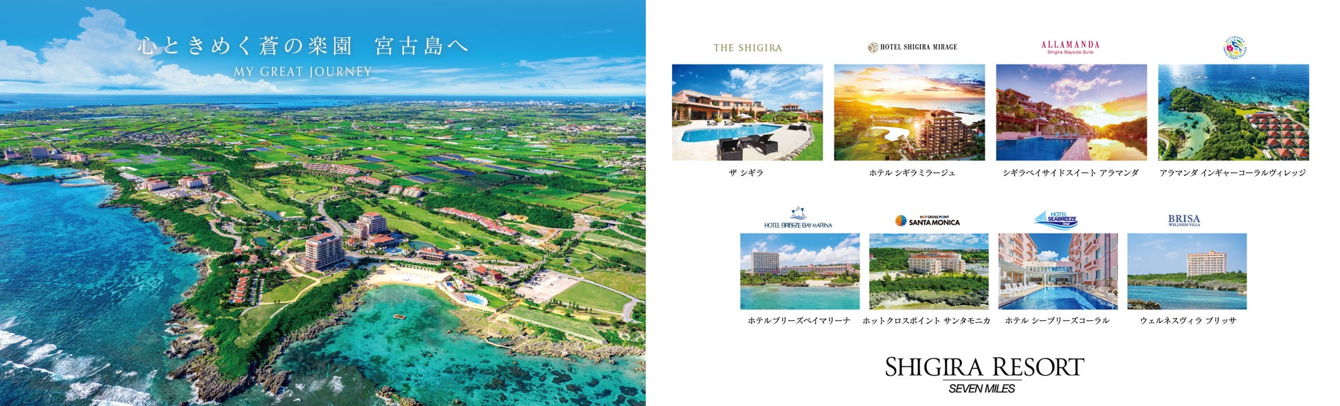 「シギラセブンマイルズリゾート」は、宮古島の南岸沿い約140万坪の広大な敷地に、カジュアルタイプからラグジュアリークラスまで、幅広いニーズにお応えする8つのホテル、35店舗以上の多彩なレストラン、ビーチ、ゴルフ場、温泉などを備えるリゾートシティとなります。