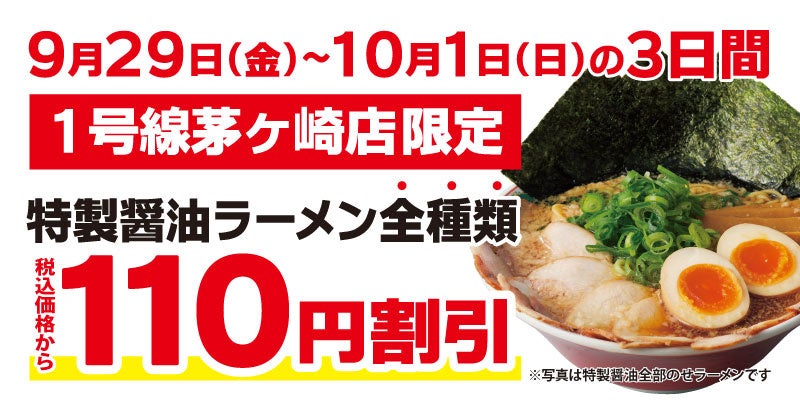 この度オープンを記念して、「1号線茅ヶ崎店」にご来店いただいたお客様には、『特製醤油ラーメン全種類』を税込価格から110円割引で販売いたします。