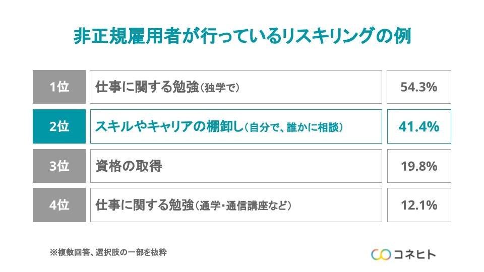 一方、具体的にどのようなリスキリングに取り組んでいるかの質問では、非正規雇用者の41.4%が「スキルやキャリアの棚卸し」(「自分で」と「誰かに相談」の合算)と回答しています。その背景には、自身のスキルやキャリアを見直しながら、今後さらに活躍できる新たな領域や環境について模索や検討をしている様子がうかがえ、非正規雇用者たちが抱えている評価ギャップを埋め、正規雇用へのキャリアアップや成長領域への適正な労働移動を促すためには、リスキリングに関する経済支援だけでよいのかという疑問にも繋がっていきます。
