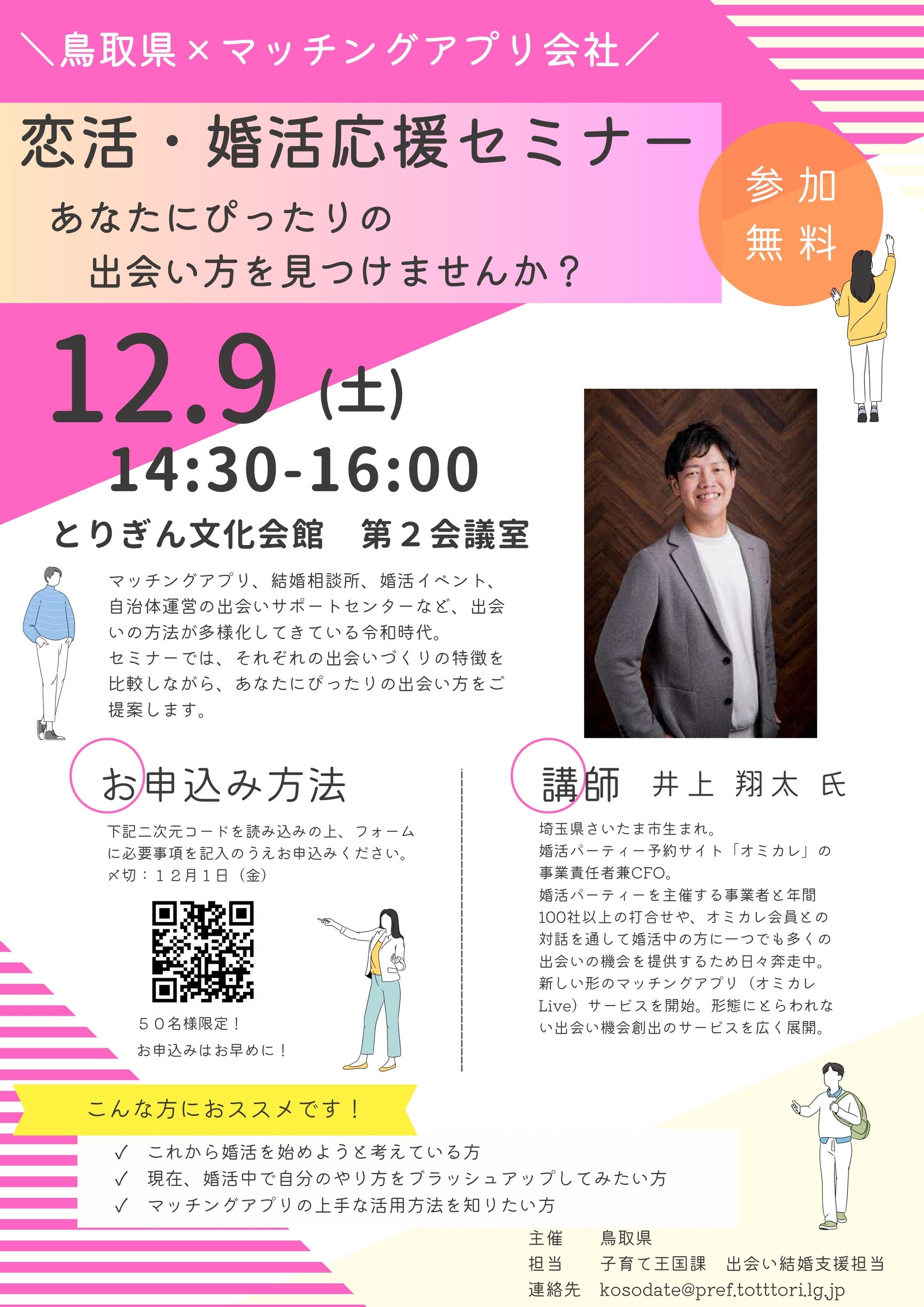 第一弾として、2023年12月9日(土)に鳥取県の婚活者に向けた「婚活サービスの選び方」セミナーを開催