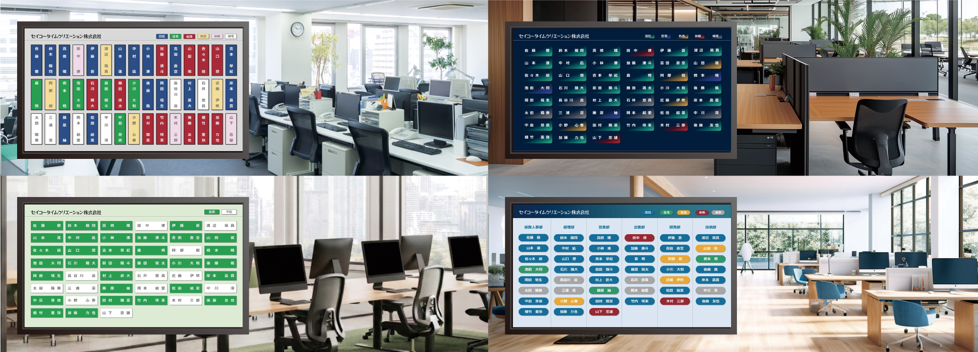 出退表示に加え、テロップ表示や会議室予約情報、緊急時の割り込み表示など、多目的な情報表示板として活用できる拡張性を備えています。