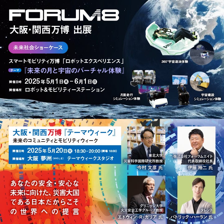 株式会社フォーラムエイト(本社:東京都港区港南2-15-1、社長:伊藤裕二、URL:https://www.forum8.co.jp)は、2025年4月13日より開催される大阪・関西万博に催事パートナーとして協賛いたします。また、その他にロボット&モビリティーステーションにてバーチャル体験ができるシミュレータシステム展示や、テーマウィークでの未来の防災・減災に向けたトークセッションを提供いたします。