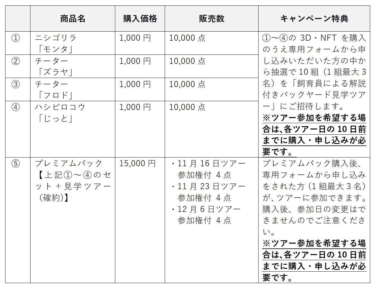 販売開始を記念して、3D・NFTを購入のうえ専用フォームから申し込みいただいた方から抽選で10組(1組最大3名)を、動物公園の裏側をより深く知ることのできる、「飼育員による解説付きバックヤード見学ツアー」にご招待します。また、3D・NFT 4種類にバックヤード見学ツアー(確約)がついたプレミアムパックもご用意しております。