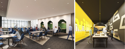 ゆっくりおくつろぎいただけるカフェコーナー(右):ラウンジや商談スペースとは別に、カフェコーナーを設けております。多くのお客様にご利用いただけるよう様々な種類を取り揃えたお飲物は、商談ルームやラウンジにもお持ち込みいただけます。